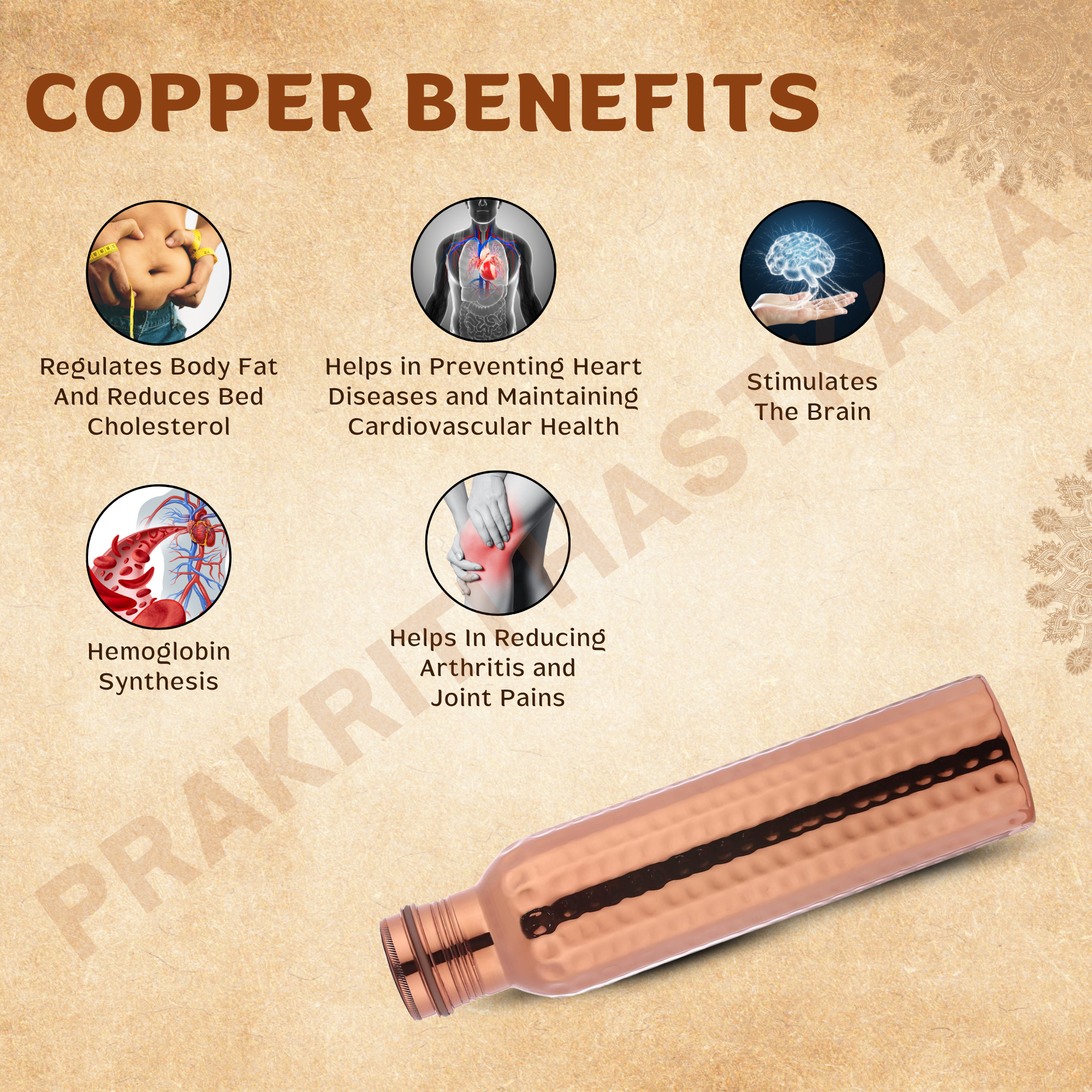 The Copper Bottle Plain & Hammered Set of 2 (PHCB10) includes one smooth plain copper bottle and one hammered finish bottle, made from pure copper for everyday healthy hydration. This compact set is ideal for daily use at home, office, yoga, or travel, offering the traditional benefits of storing water in copper, which is believed to help keep water fresh and support overall wellness. The bottles are durable, eco-friendly, easy to carry, and designed with leak-proof caps, while the combination of plain and hammered finishes adds both elegance and a handcrafted look.