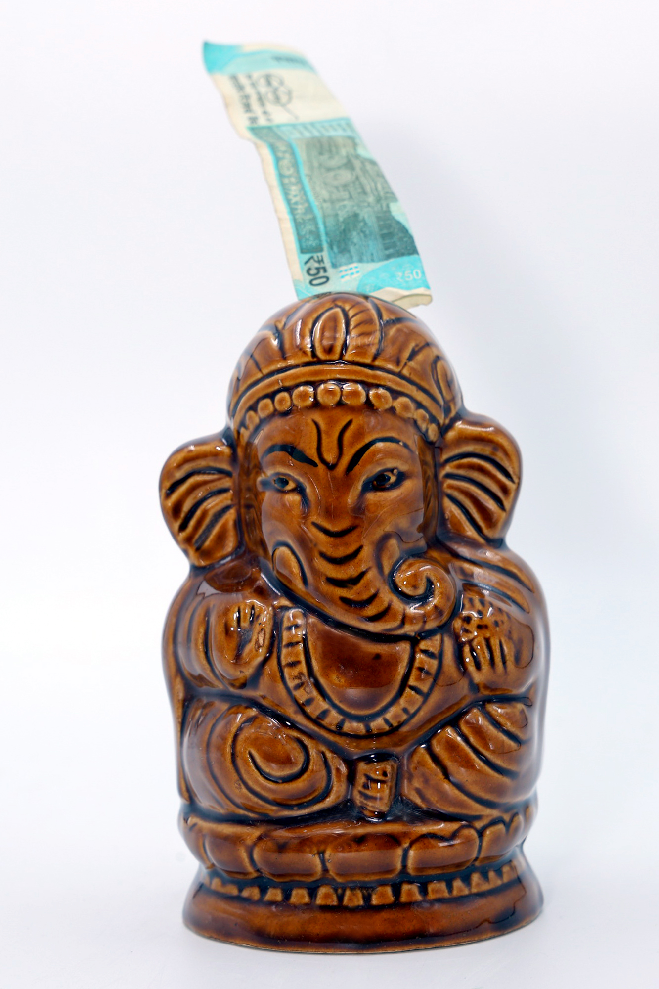This ceramic handmade Ganesh God idol money bank is beautifully crafted with fine detailing and a smooth, glossy finish that enhances its divine appeal. Made from high-quality ceramic, it features Lord Ganesha in a serene and auspicious form, symbolizing wisdom, prosperity, and good fortune. The thoughtfully designed coin slot allows for convenient saving while maintaining the elegance of the idol. With its sturdy base and graceful presence, this Ganesh money bank serves as both a functional savings accessory and a spiritual décor piece, making it ideal for home temples, living spaces, or as a meaningful gift for festive and special occasions.